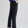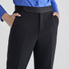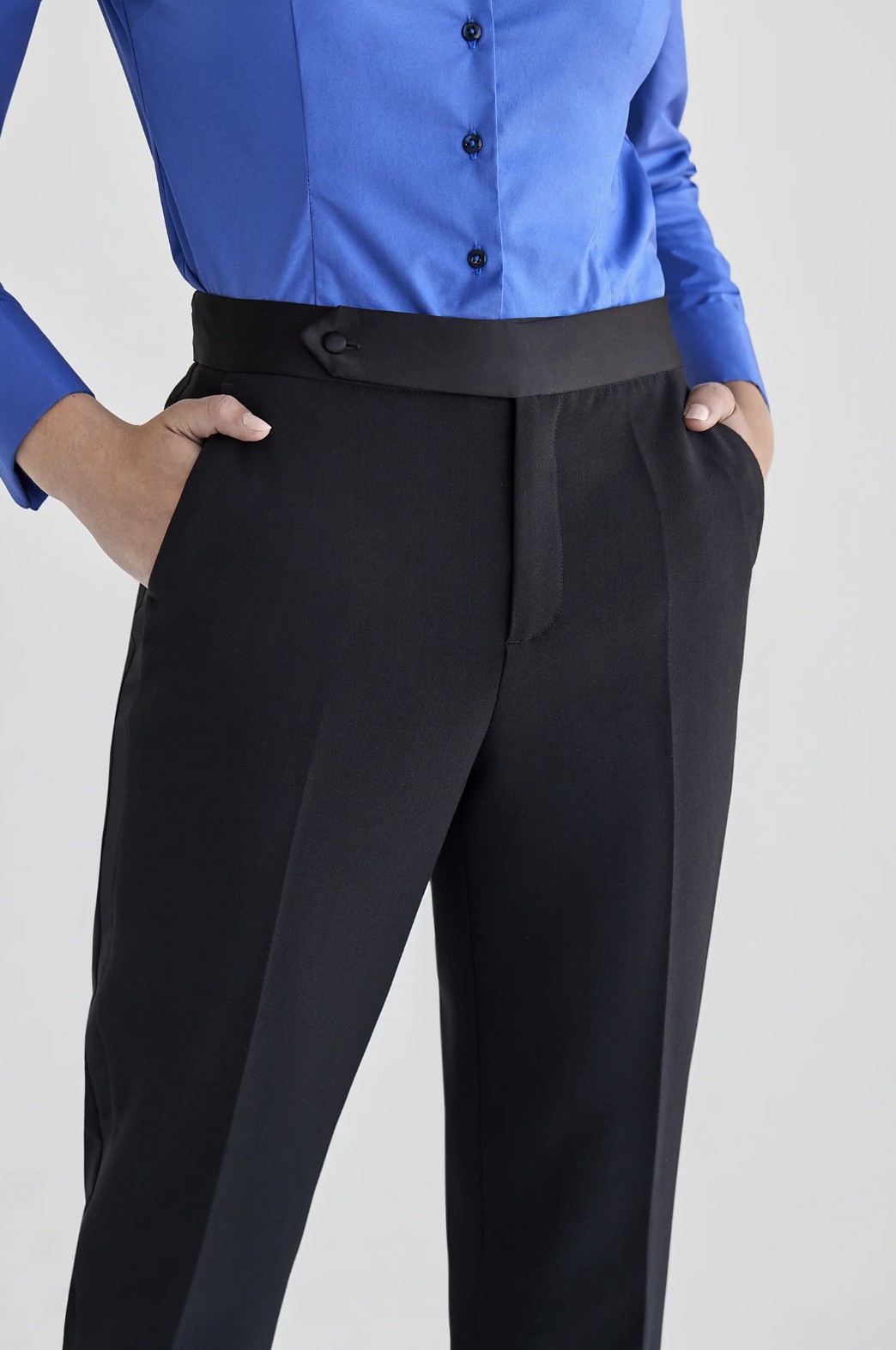 Flat front. Hint of stretch in the fabric. Straight leg silhouette. Satin waistband trim. Zip fly front with extended button closure. Front pockets. Satin side stripe.