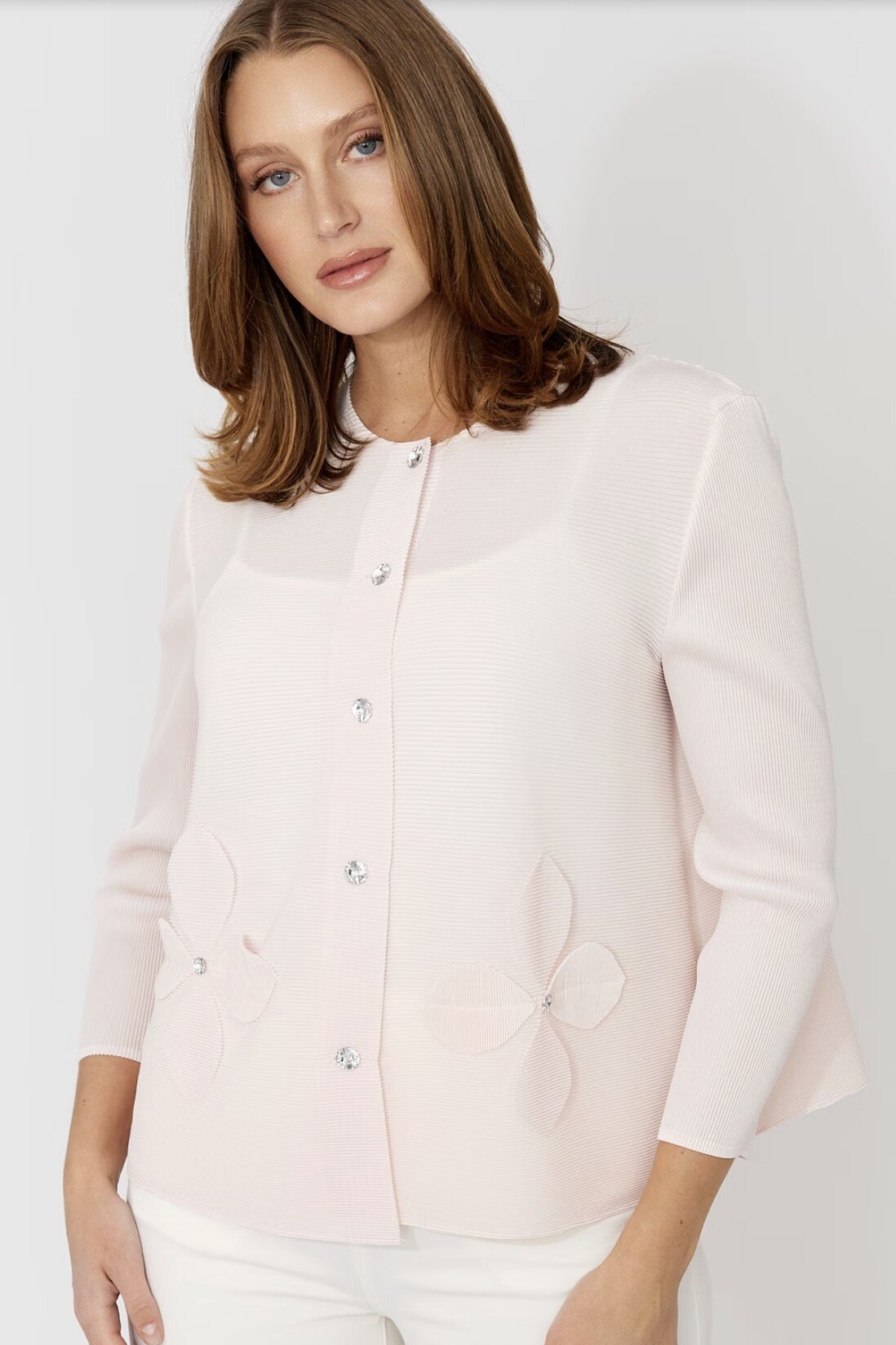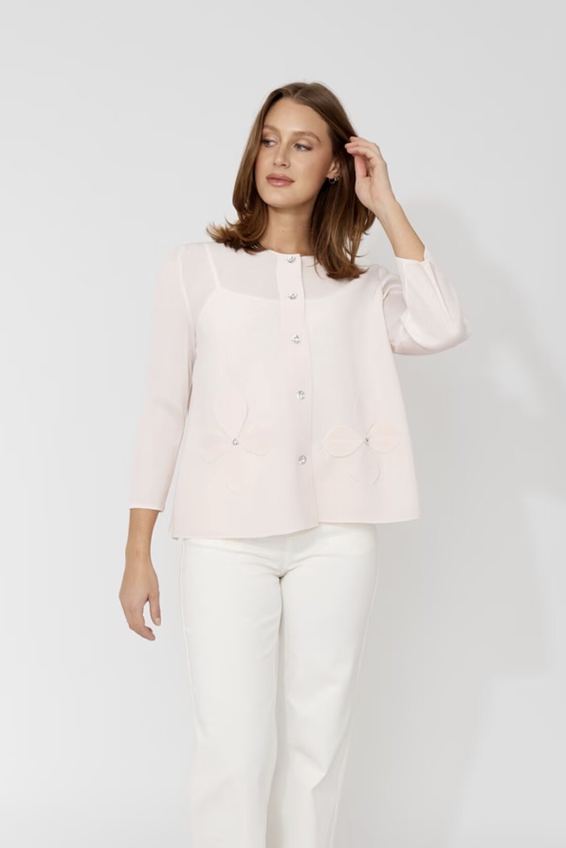 Step into effortless elegance with this Frank Lyman cardigan. Featuring a button closure and a collared neckline, this hip-length piece combines casual and semi-formal styles effortlessly. The 3/4 straight sleeves adorned with buttons and jewels add a touch of feminine charm. Its regular fit and plain pattern make it a versatile addition to any wardrobe, perfect for everyday wear.