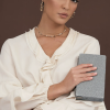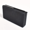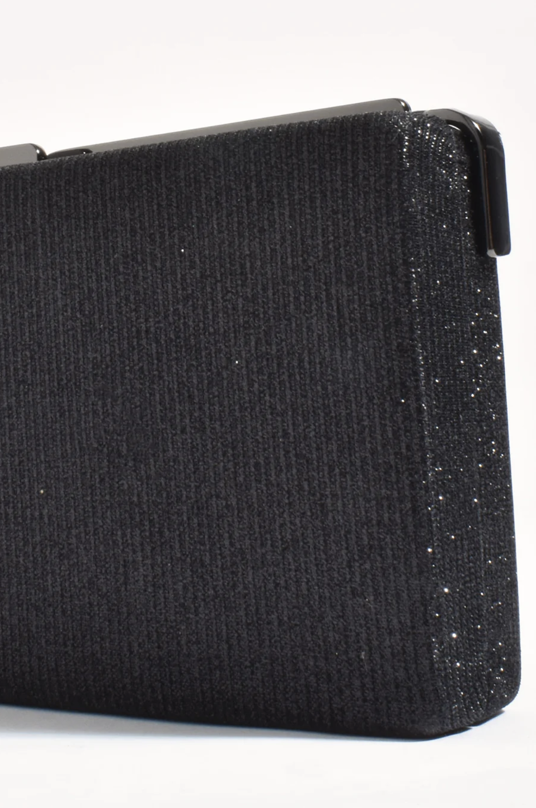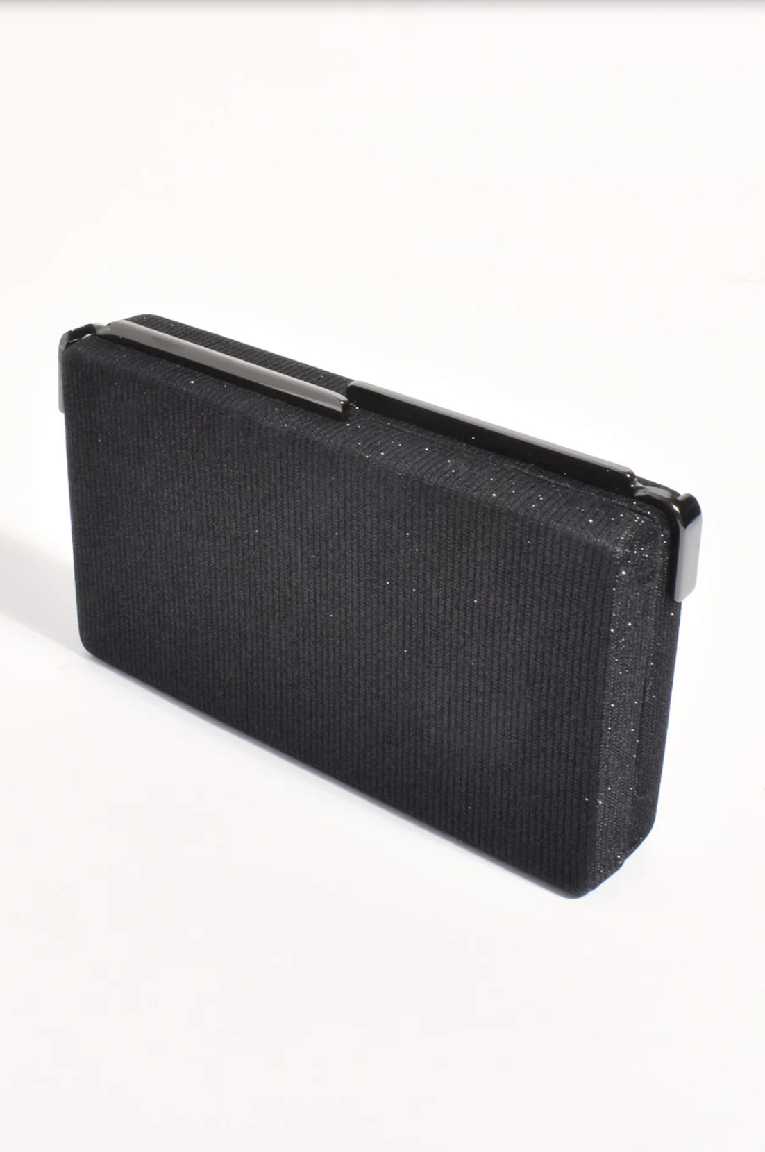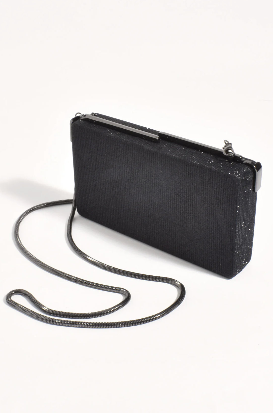 Description: A sleek black clutch designed to rest gently against your body, moving with you rather than against you. Its softly textured finish catches the light like starlit soil, grounding yet quietly luminous. Finished with a delicate chain strap, this piece feels effortless and intentional — a timeless companion for evenings shaped by simplicity, strength, and natural elegance.