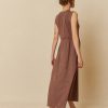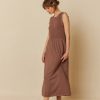 In a warm brown hue, its classic silhouette and maxi length create a graceful, elongated line, while the lightweight fabric moves softly with every step. Feminine and understated, it’s a dress that carries effortless charm—perfect for sunlit gardens, weekend getaways, or evenings that call for a touch of quiet sophistication.