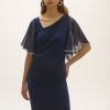 This dress is pure elegance, with luxurious silky knit fabric cut into a form-flattering sheath silhouette that’s simply captivating. The stunning chiffon butterfly sleeves add a touch of drama, while expertly placed pleats and trim at the sleeves enhance the design. Topped off with a unique asymmetrical neckline, this piece isn’t just a dress – it’s a statement. Part of the SIgnature collection.