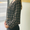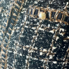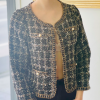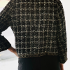 This lined jacket is a plaid pattern containing black, white & gold features and is discreetly littered with holographic sequins to attract the eyes. It also has 4 pockets with pearls and a unique trim around the whole garment.