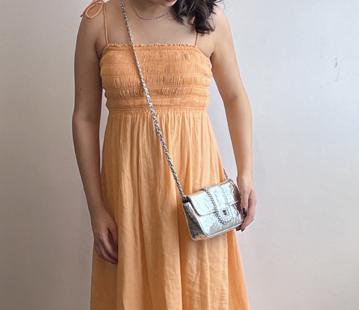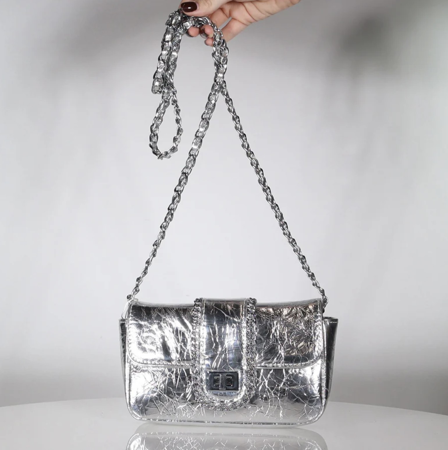 This bag catches the light from every angle, making it the ultimate accessory for a night out. The chic chain and woven leather crossbody strap add a touch of edge while keeping your hands free for dancing or drinks. Compact yet spacious enough for all your essentials, the Cosmic Diva takes your evening look to the next level!
