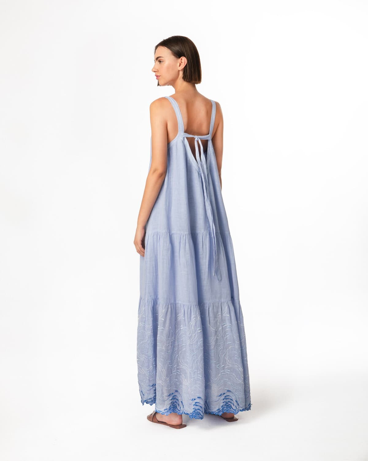Feel the ease of summer in this cream Harris Cotton dress, crafted in Greece from 100% linen. The soft fabric and delicate blue embroidery evoke sunlit days by the sea and slow evenings on cobbled streets. Light, effortless, and beautifully timeless — it’s the kind of dress that takes you places, even if you never leave home.