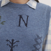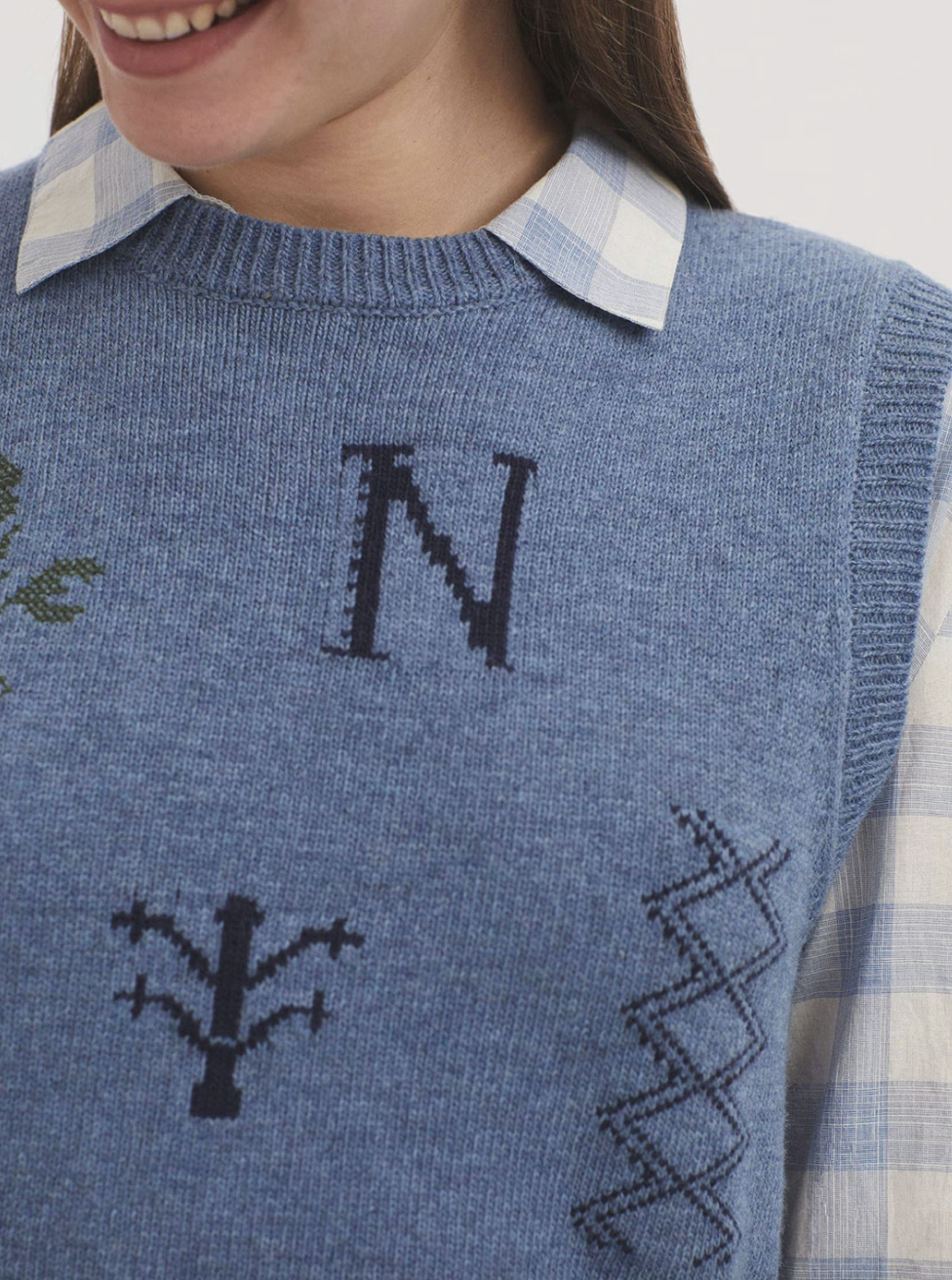 Round neck wool blend vest. Embroidered and cross-stitched details. Ribbed finish.