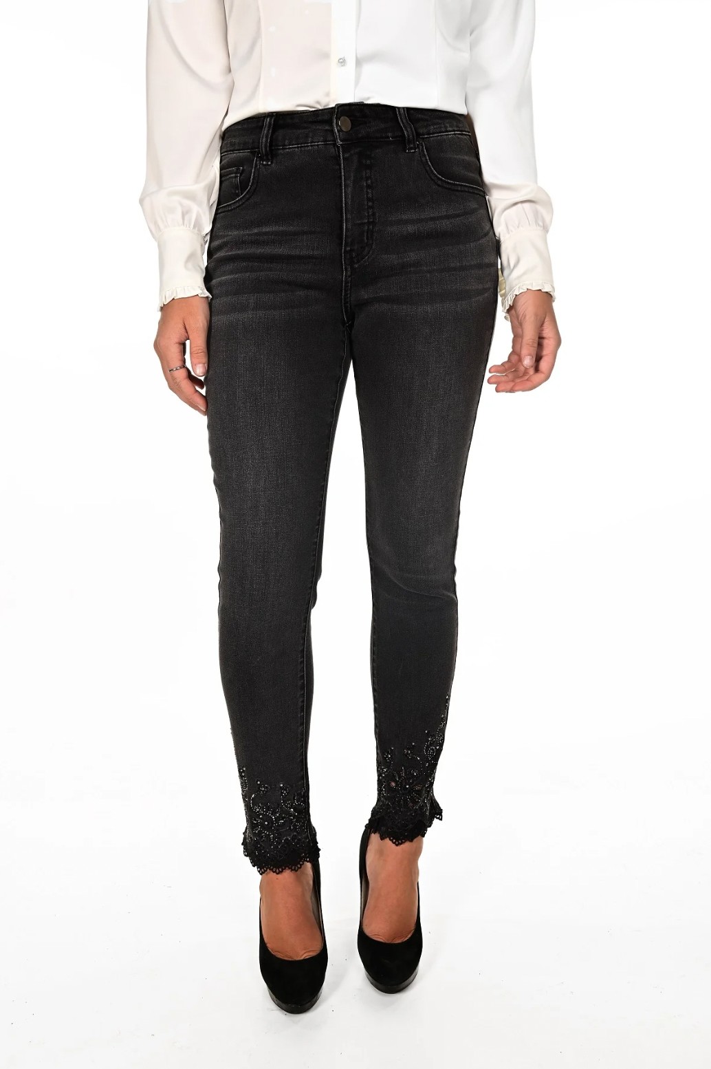 Frank Lyman knows how to work a touch of dazzle into your denim. These stylish jeans featuring a flattering and stretchy fit, hugging your figure in all the right places. The ankles are elevated with a rhinestone and lace detailing, which adds a girly touch. You’ll love how these transform your everyday jean into something extravagant.