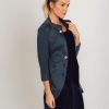 Features faux pocket flap and high-low style with military neckline, stretchy t-shirt backing and cotton front with decorative non-functional buttons lining the front. Lightly frayed hem and washed look fabric give this jacket a distressed edge