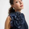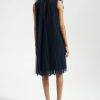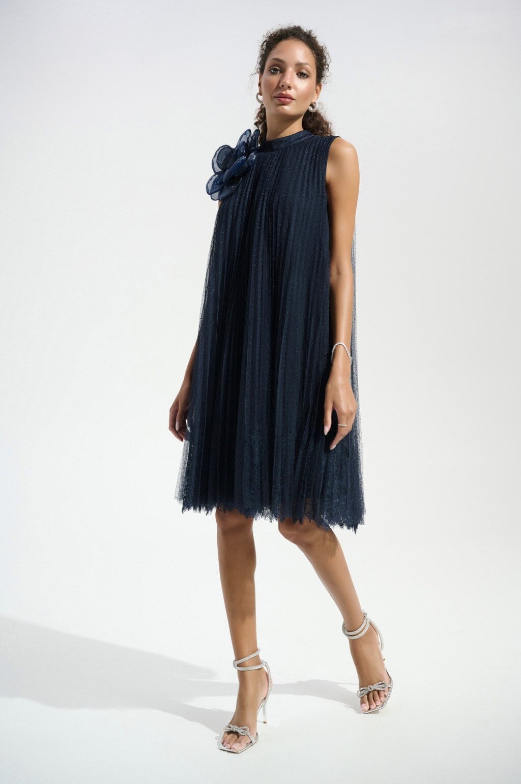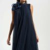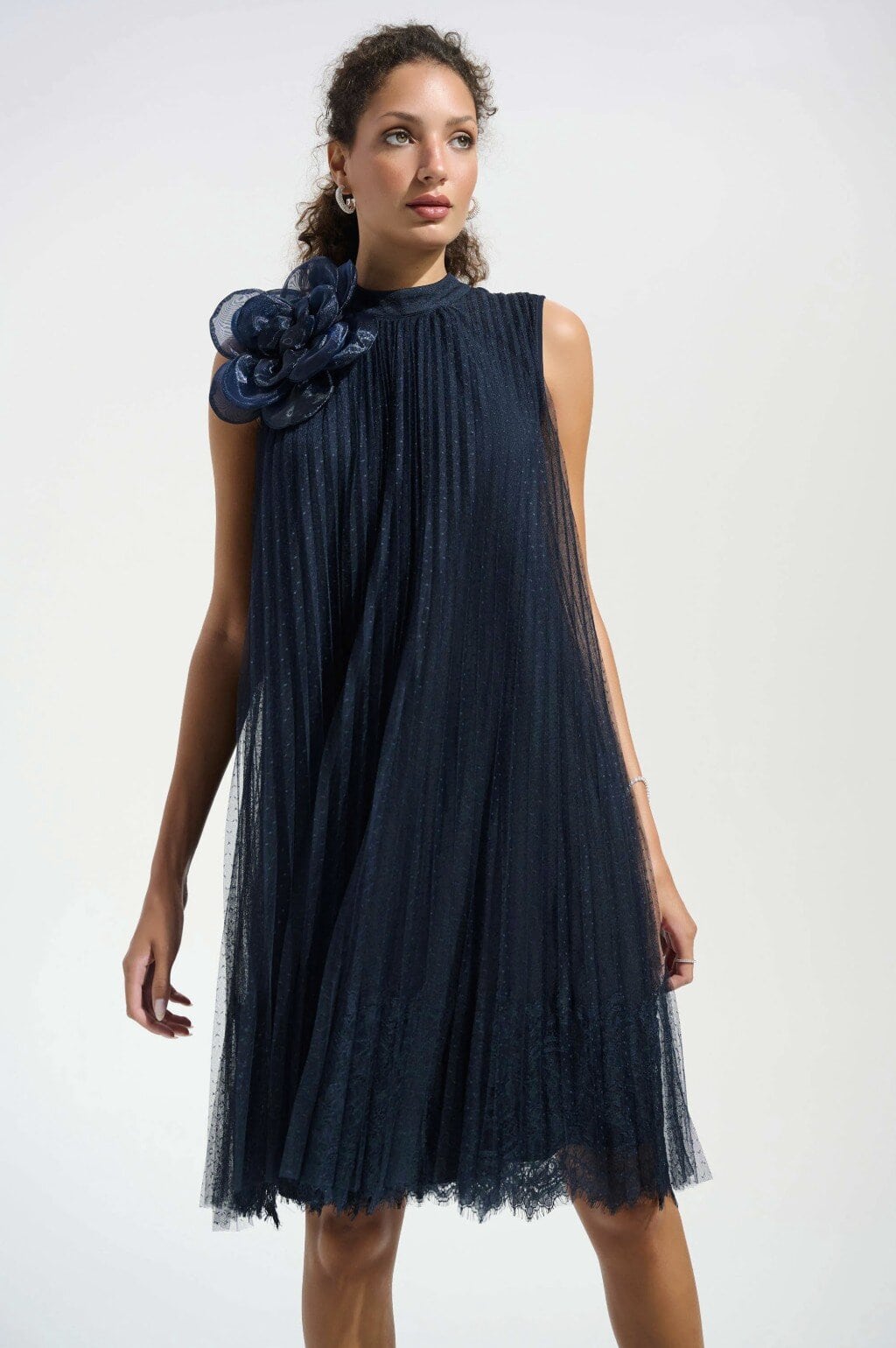 A soft mock neckline topped with an organza flower sets a refined tone for this layered A-line dress. Sheer dot mesh and a lace-trimmed hem bring delicate movement to the knee-length silhouette.
