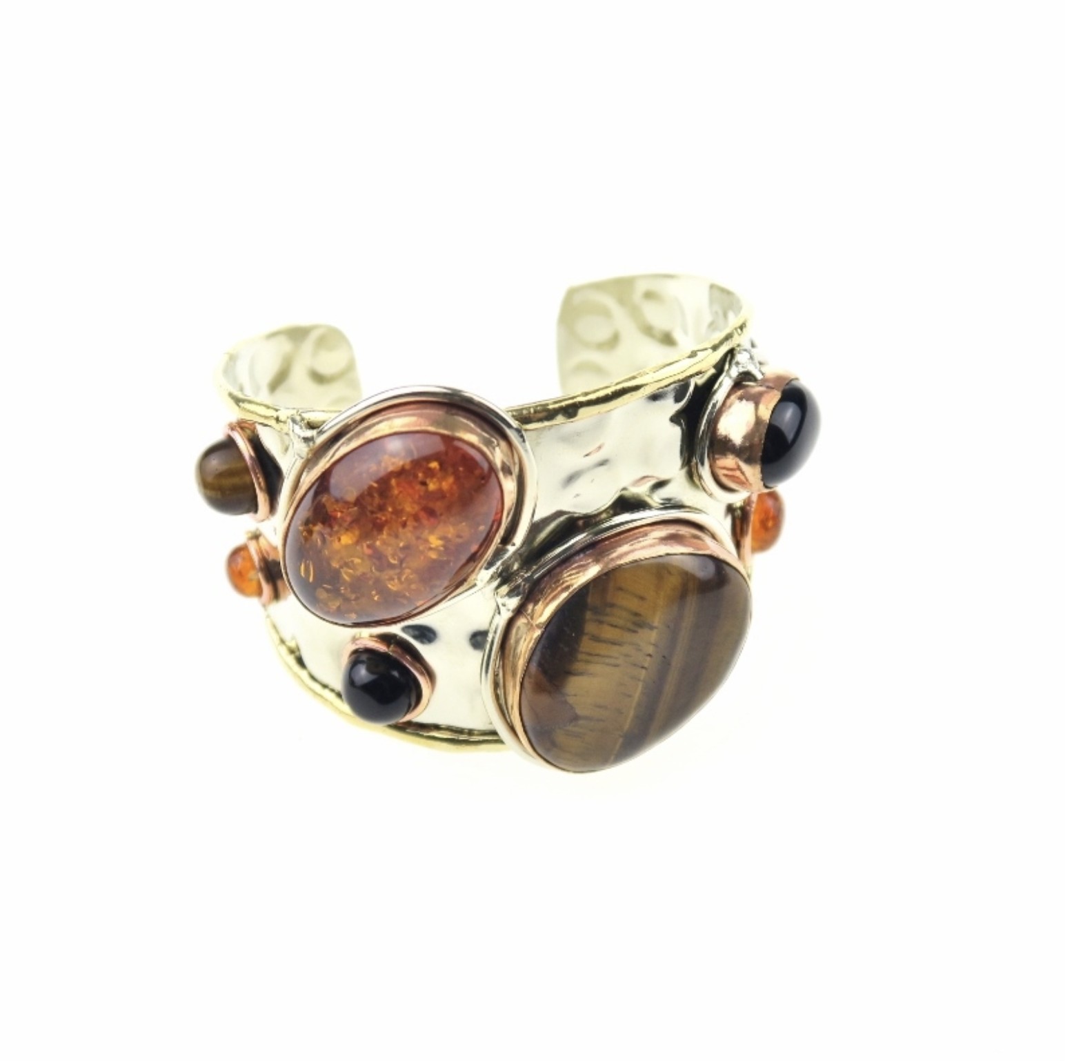 This stunning cuff bracelet features a brass bangle adorned with a captivating array of brown and orange stones, including Multi Amber, Tiger Eye, and Black Onyx. The unique combination of semi-precious stones creates a warm, earthy aesthetic that complements any outfit. Perfect for adding a touch of elegance and individuality to your jewelry collection.