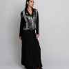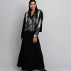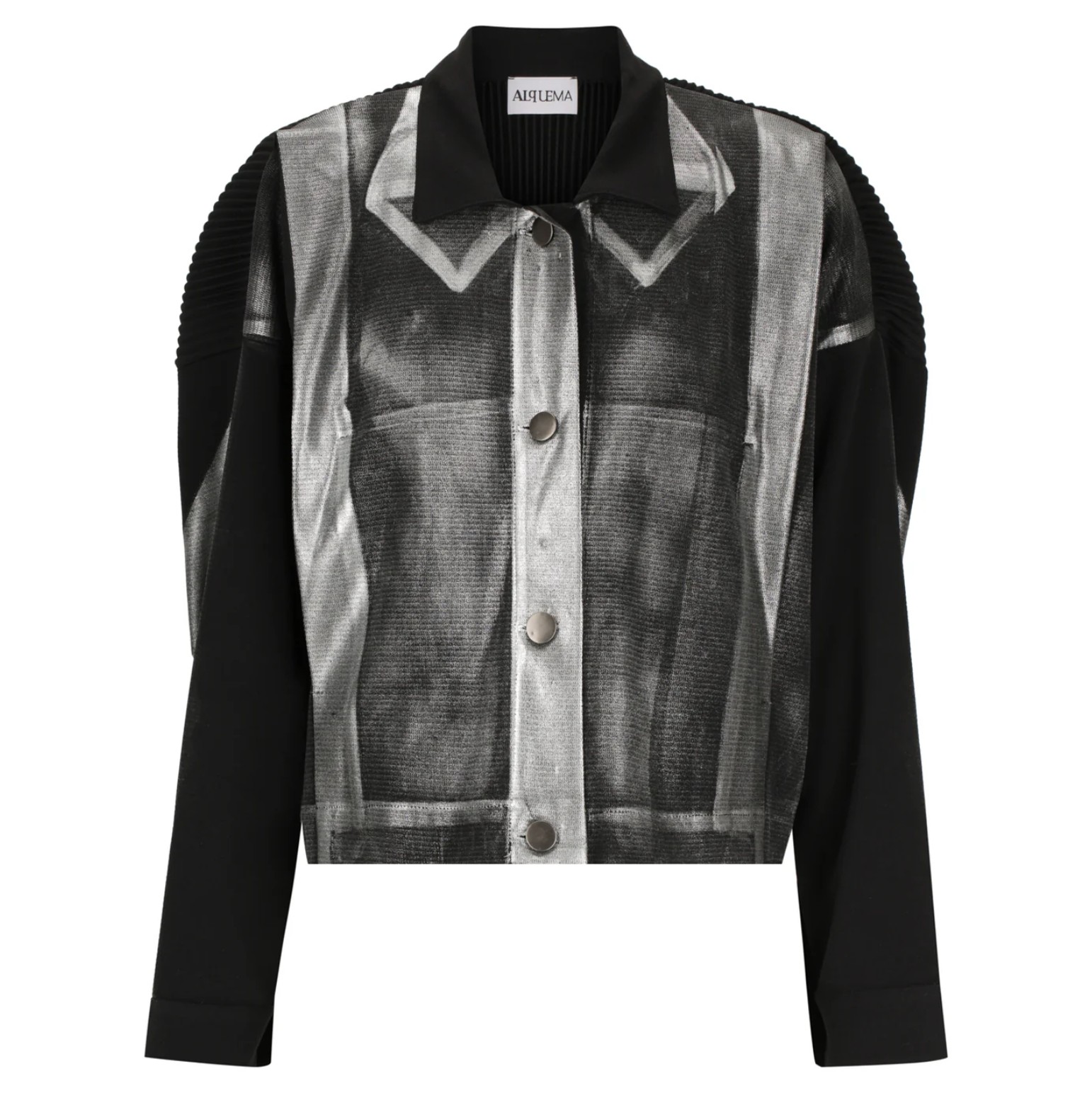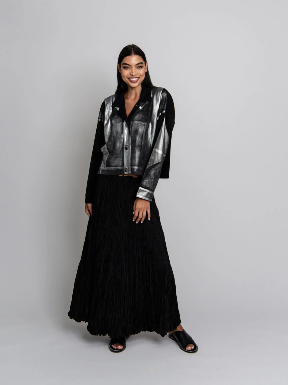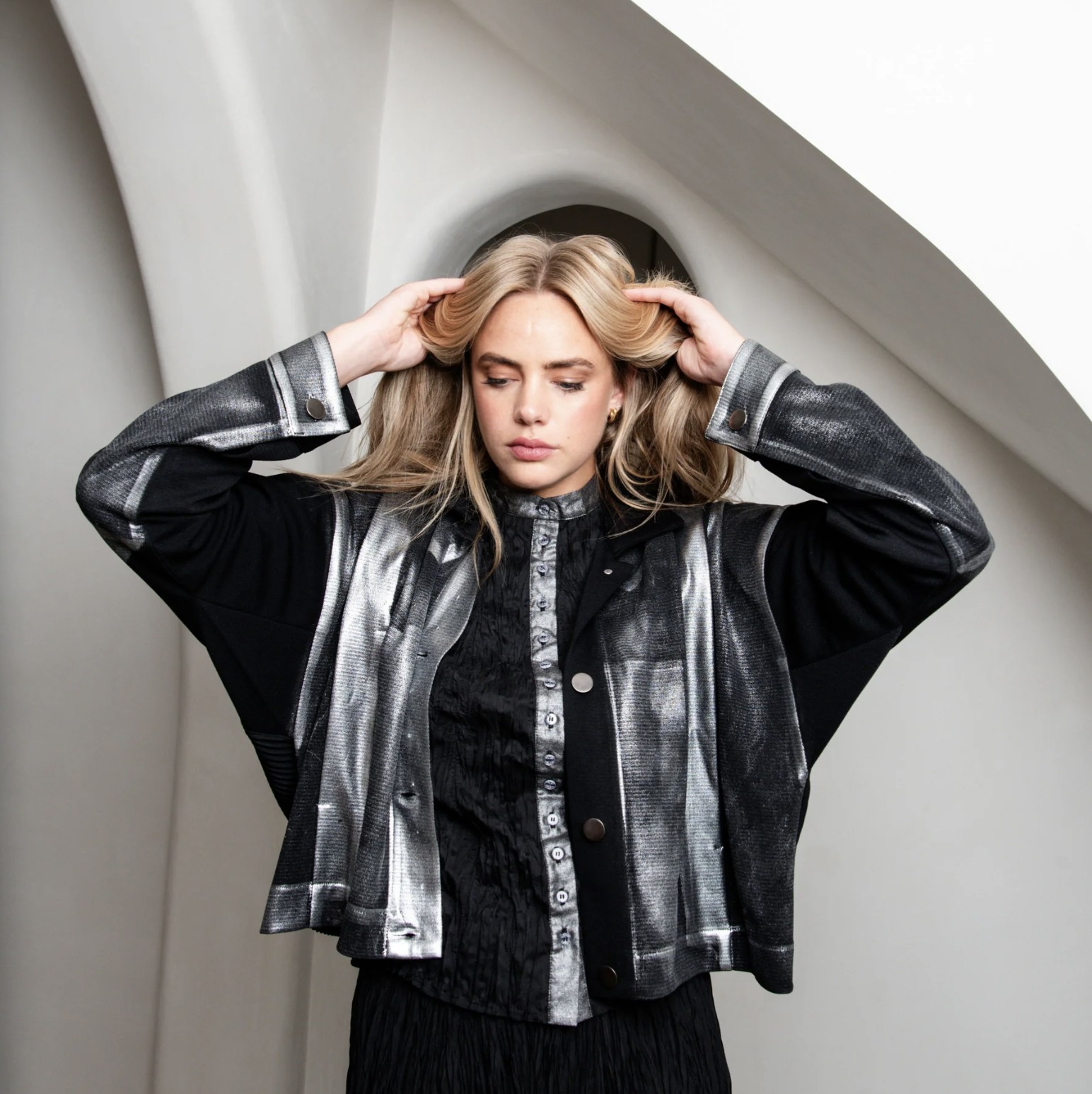 A contemporary statement, the Foil Plisse Jacket captivates with its brushed silver finish and impeccable detailing. The sprayed-on, silver-like texture evokes a modern, artistic aesthetic. This design is further enhanced by its cropped, relaxed fit and adorned with silver buttons. This bold layering piece adds a unique, edgy flair to any ensemble.