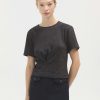 This garment is a stylish short-sleeve top featuring a round neckline, making it a versatile and easy-to-wear piece. The key design element is the gathered detailing which adds texture and visual interest to the piece, creating a flattering silhouette. The fabric itself is shimmery, giving it a subtle shine and making it suitable for both casual and dressier occasions. The top is made in Portugal with the perfect combination of elements making the top elegant yet comfortable, perfect for a variety of outfits.