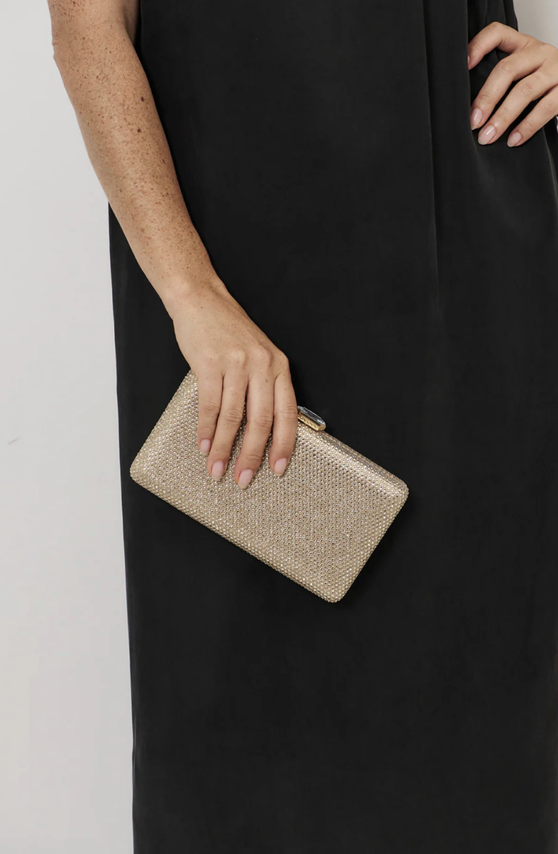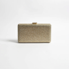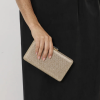 Description: The Diamante Rectangle Structured Clutch in Gold features a clip closure and an optional chain strap. Crafted from mini diamante and vegan leather for a sleek, structured finish.