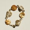 Symmetrical pattern of mother of pearl disk beads in a burnt orange and natural shell beads. Non-tarnish and hypoallergenic, this piece features durable golden 304 stainless steel base, making it ideal for daily wear.
