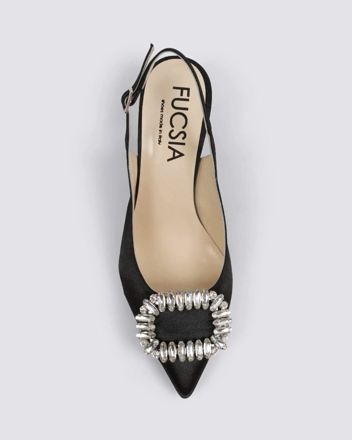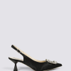 Impeccably crafted in Italy, this shoe dazzles with its faux diamond embellishments and a chic flared kitten heel measuring 5cm. The premium leather upper, lining, and sole ensure utmost comfort and quality. With its luxurious design, it effortlessly melds traditional craftsmanship with modern allure, making it an iconic piece in the world of luxe fashion.