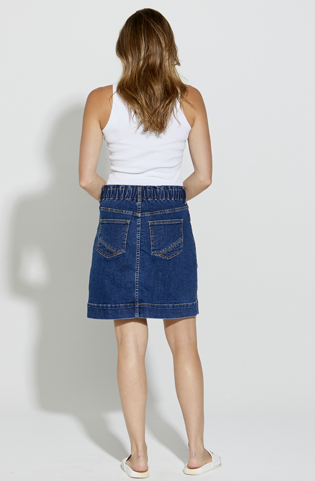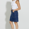 Simple, kneelength timeless slightly aline denim skirt. Featuring a flat front, elastic back and large patch pockets.