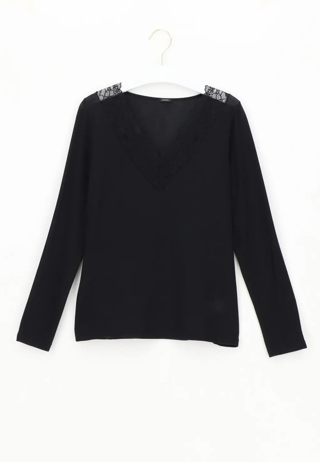 This top has an elegant and refined appearance, fitting harmoniously to your silhouette. Its V-neck embellished with delicate lace adds a touch of femininity and sophistication, perfect for special occasions or to add a touch of class to your daily routine.