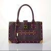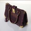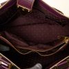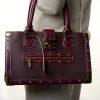 A Louis Vuitton plum Suhali leather fabuleux bag. Handcrafted in plum Suhali leather, with smooth plum leather trim with contrast white stitching, gold tone corners and stud detailing, a zip pocket at front exterior, double leather top handles and an S-lock closure at front with locking system, together with a key and clochette. Interior is lined in plum nylon with LV logos. Two compartments are seperated by a zip pocket and two slip pockets. Gold-tone hardware.