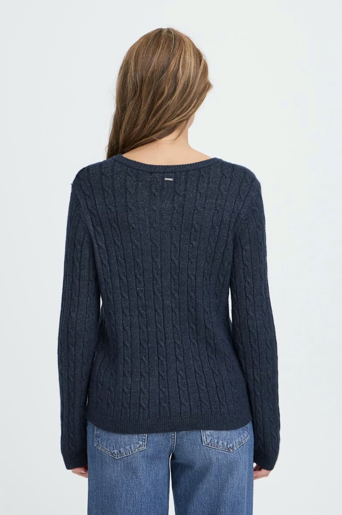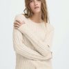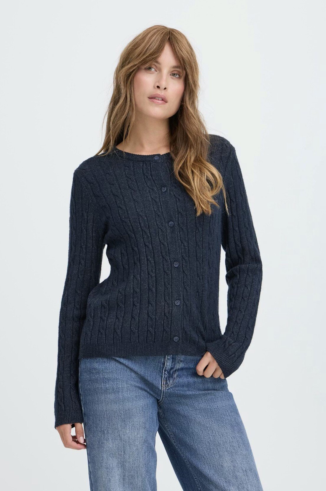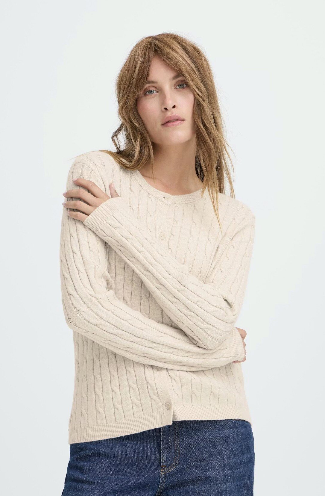 Cable knit cardigan with a straight silhouette and soft finish. Features a classic crew neckline, long sleeves, button front, and ribbed edges for a clean, minimal look.