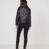A modern statement layer with a bold twist, this black jacket is crafted from a sleek, puffer-style fabric that delivers warmth without the bulk of a traditional puffer. Designed with an asymmetrical collar, it features striking leopard print detailing through the collar and cuffs—adding just the right amount of edge and individuality