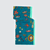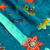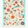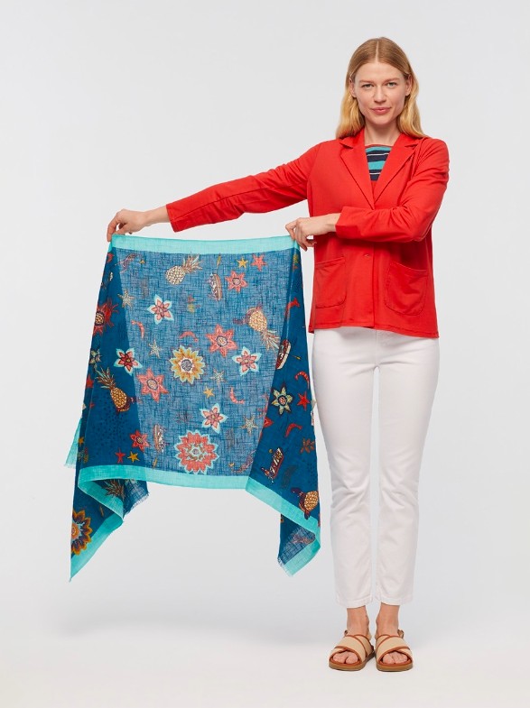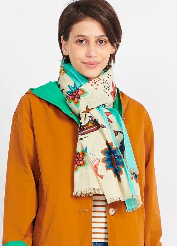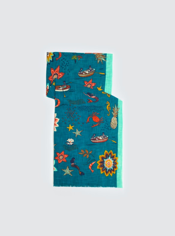 Mermaid Affairs Shawl, with a varied and colorful print that includes flowers, mermaids, crabs and starfish. Made of 100% cotton, with two background colours, blue or beige, contrasting side stripes and frayed edges.