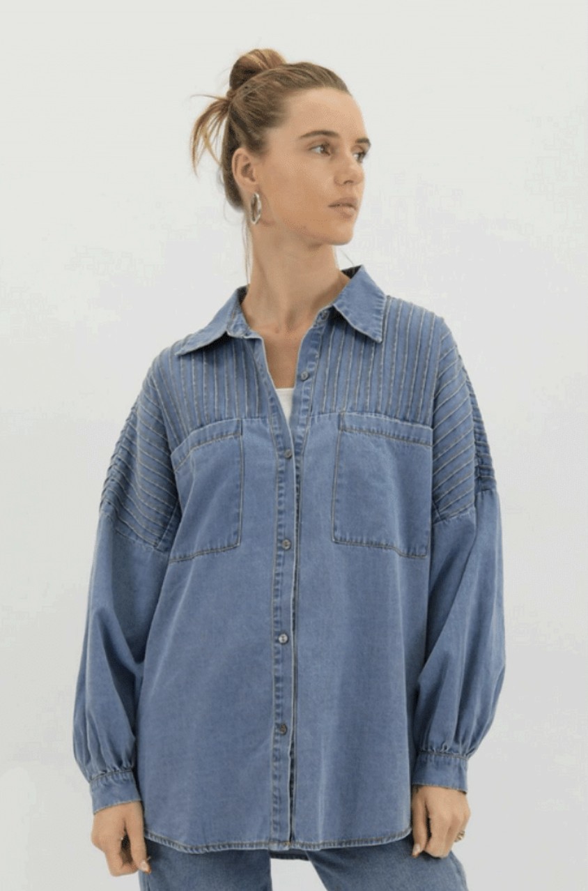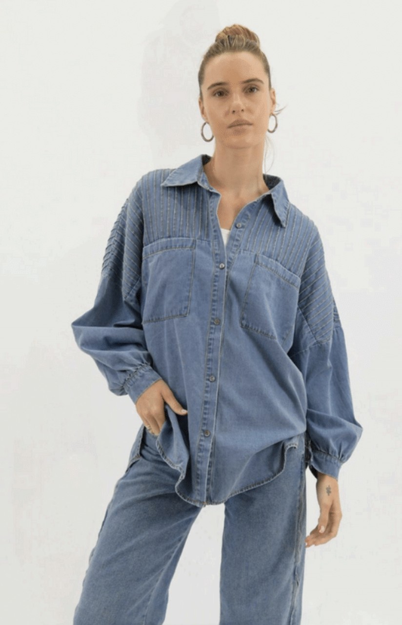 A fresh twist on a classic — this 100% cotton denim shirt brings subtle drama to your everyday wardrobe. Featuring delicate front pleats, a structured collar, and soft puff sleeves, it blends timeless tailoring with a relaxed, silhouette.