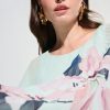 Light chiffon with floral placement pleating flows over a silky knit base in this layered poncho top. A boat neckline and centered V-hem create graceful lines, while three-quarter sleeves add effortless balance to the fluid drape.