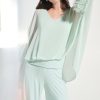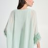 Chiffon and silky knit create a fluid poncho top, styled with a V-neckline and blouson front for graceful movement. The draped back and three-quarter dolman sleeves with novelty cuffs bring elevated charm, balanced by an attached cami.