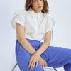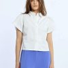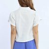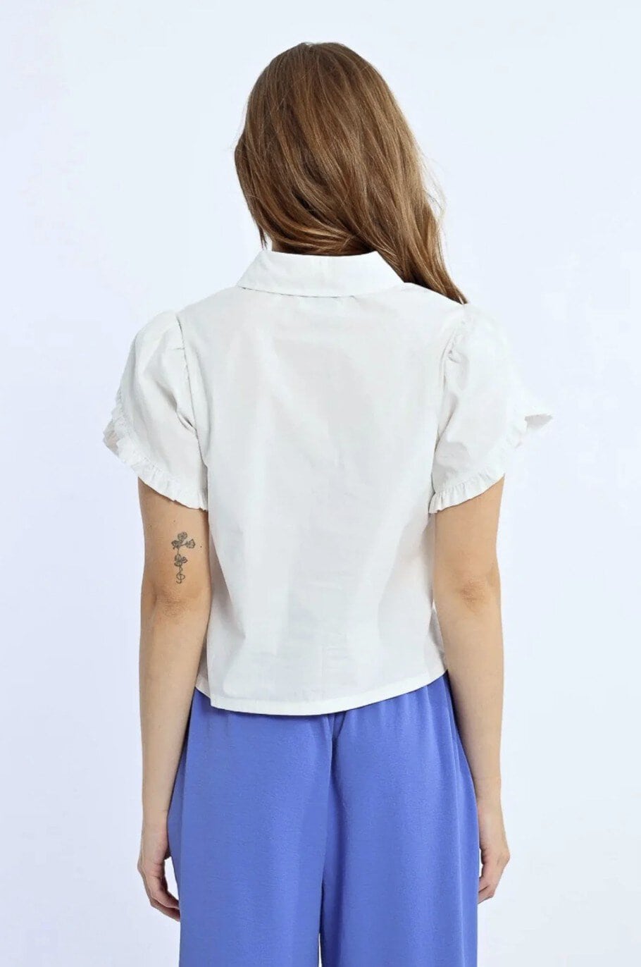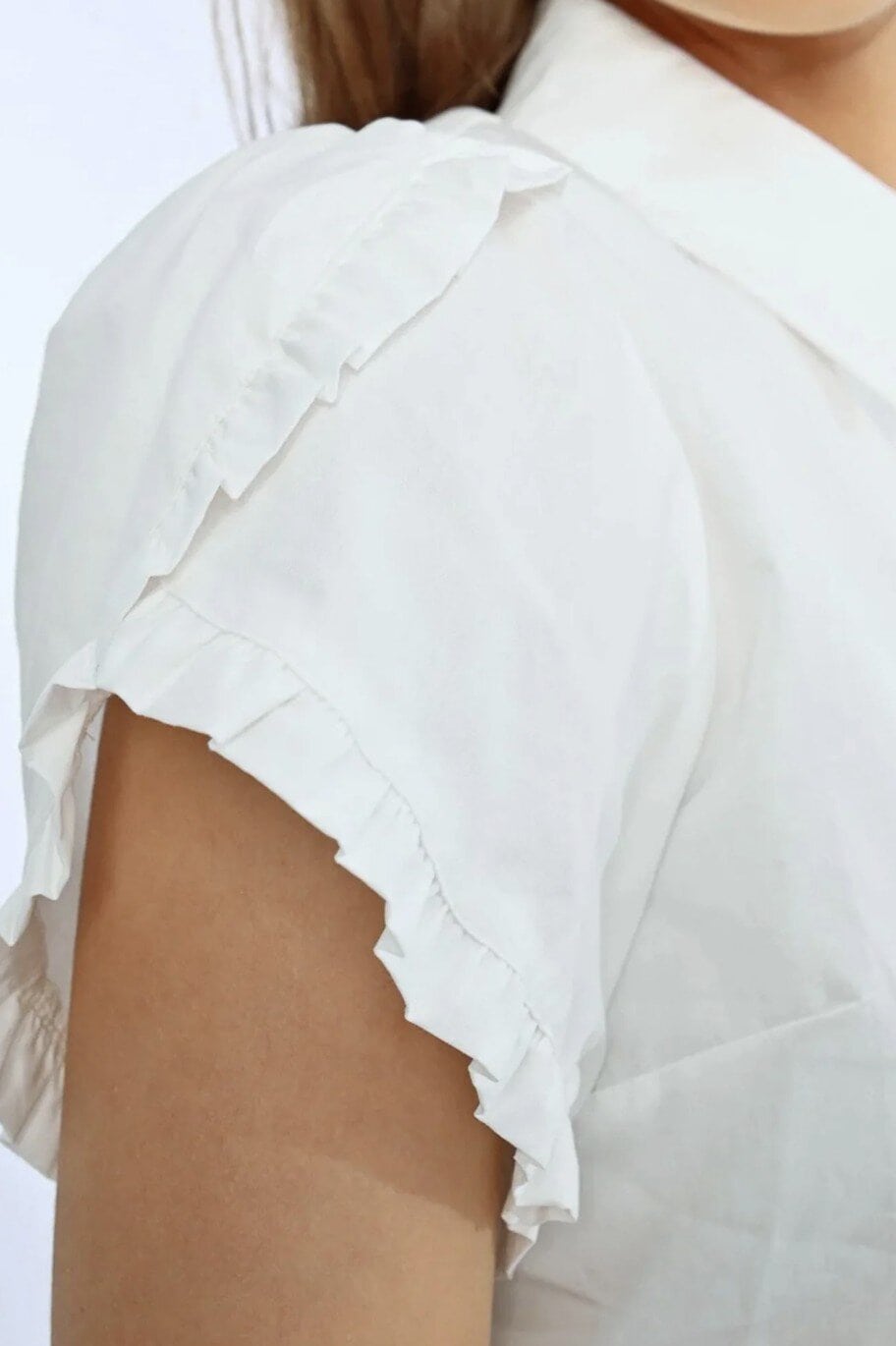 This playful piece features a blouse collar and convenient front button closure. The short-sleeved volume design adds a touch of flair, while the short and straight cut keeps things effortlessly chic. Perfect for mixing and matching with your favorite bottoms!