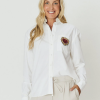 It features a button-down front, classic collar, and a relaxed fit that makes it easy to style tucked or loose. The intricate heart embellishment adds a unique, playful touch to an otherwise timeless piece.