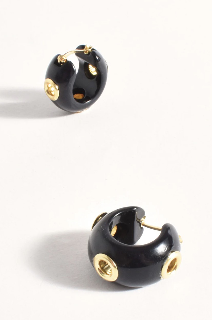 These mini statement earrings feature resin hoops with eyelet details and a clip-in back closure for easy wear. Made from a combination of resin and plated metal, they offer a lightweight, stylish look with a bold yet compact design. The mini hoops add a delicate touch while making a statement.
