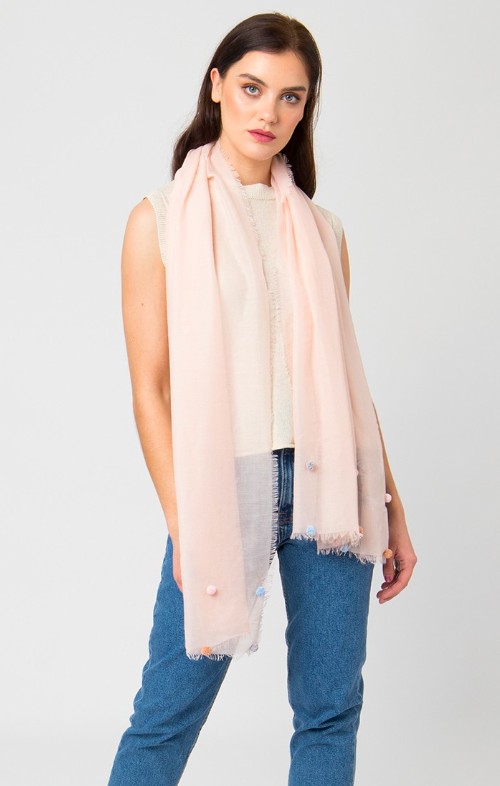 This Scarf is super soft! It includes pompom detailing and frayed edges. The Sadie Scarf has a lightweight and semi-sheer finish.