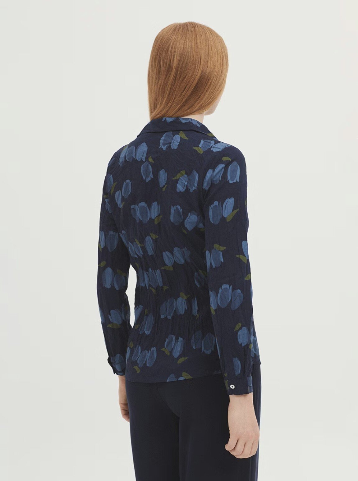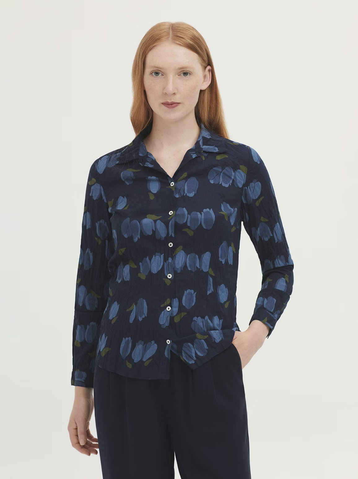 Made from sustainable crinkle cotton with a relaxed, lived-in feel. Finished with a classic shirt collar, luminous mother-of-pearl buttons, and long sleeves with a subtle vent and cuff.