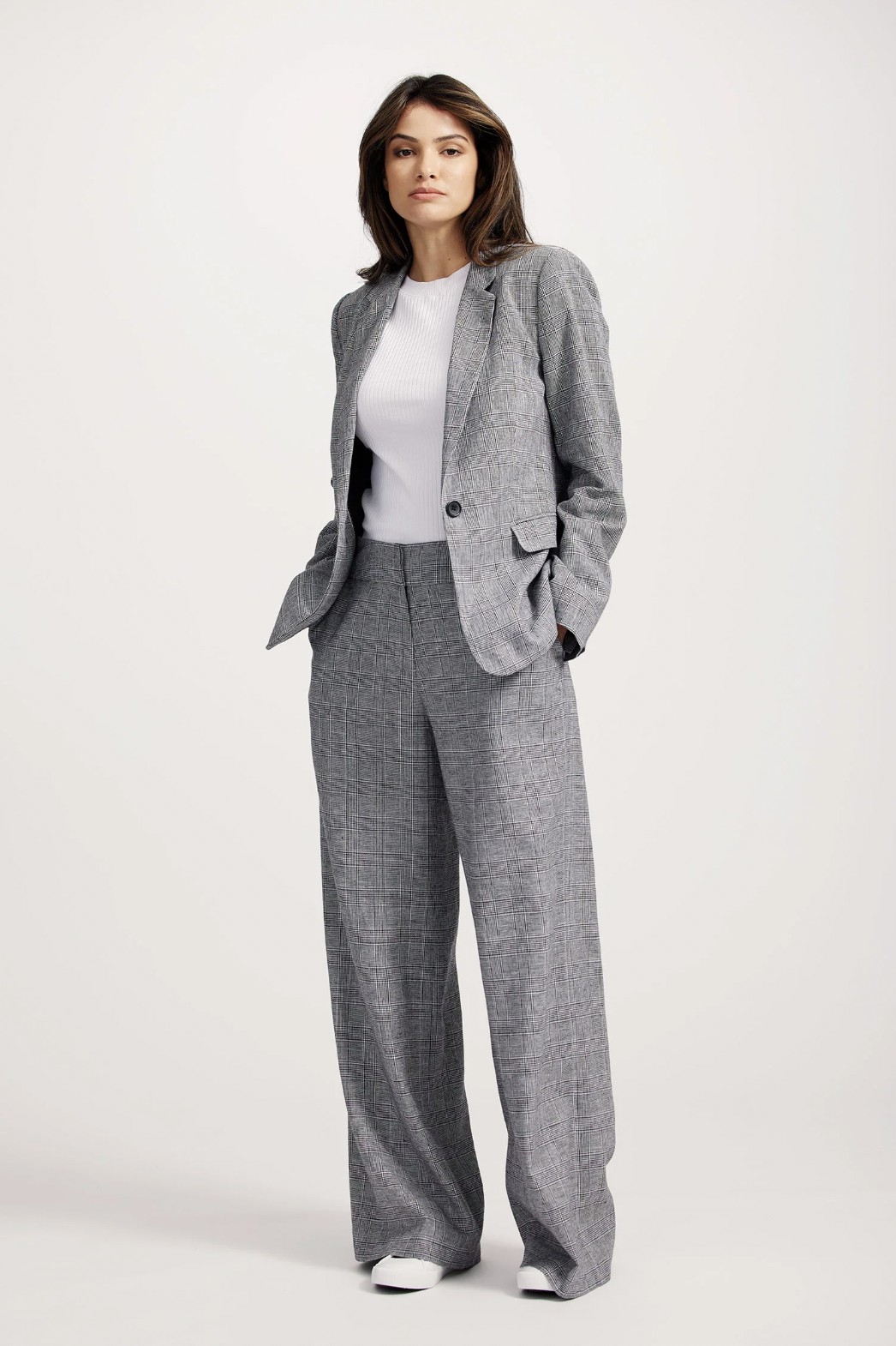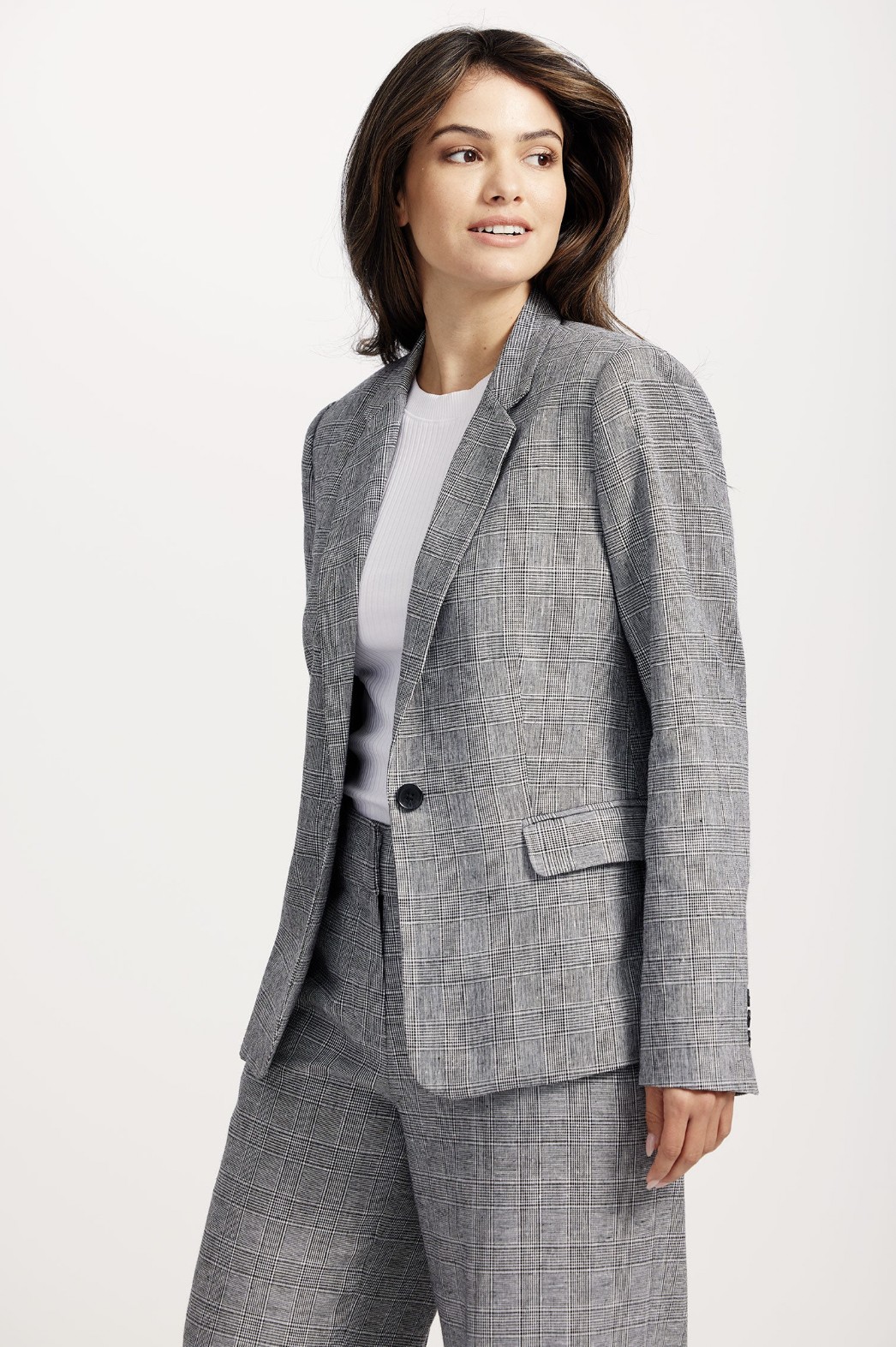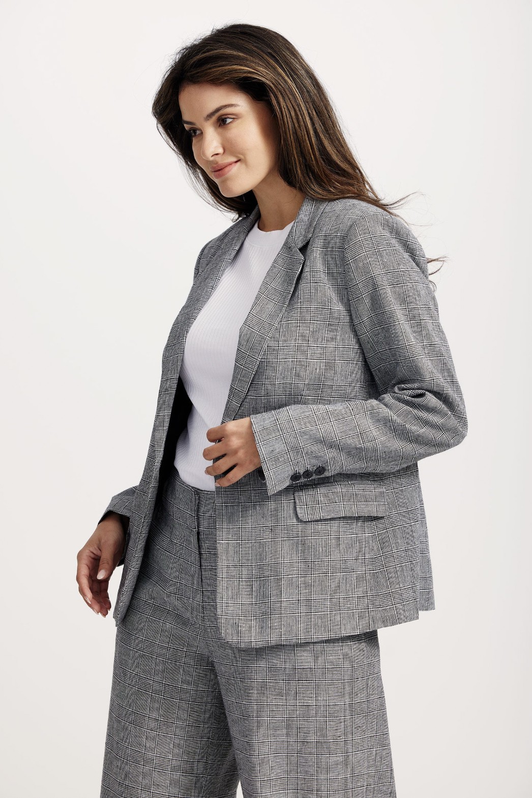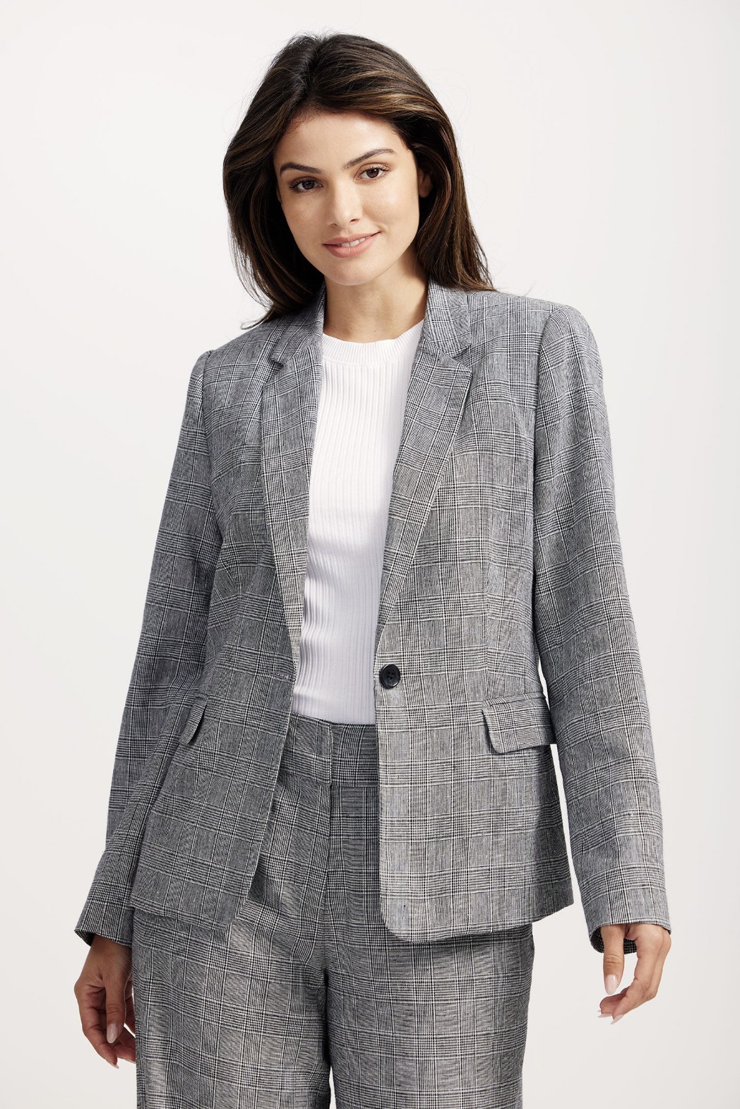 Fierce, fabulous and ready for anything when you suit up in this classic tailored Sophia check blazer.