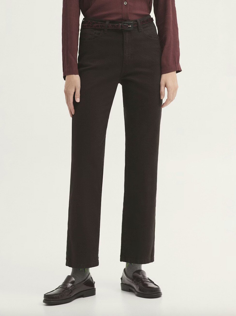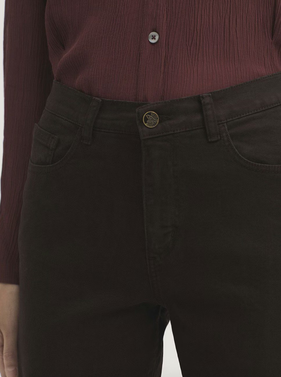 Five-pocket trousers in sustainable cotton fabric. Regular fit with a mid rise and straight leg. Front scoop pockets and back patch pockets, finished with a classic button and metal zip fastening. Regular length, high stretch. Made in Spain.