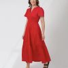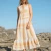 Effortless elegance meets holiday-ready style in this cross-over V-neck tiered maxi dress. Crafted from soft 100% cotton, it features a concealed snap stud at the neck and a neckline bib panel for flattering shaping. Flowing tiers create movement and ease, making it the perfect choice for island escapes or relaxed resort wear.