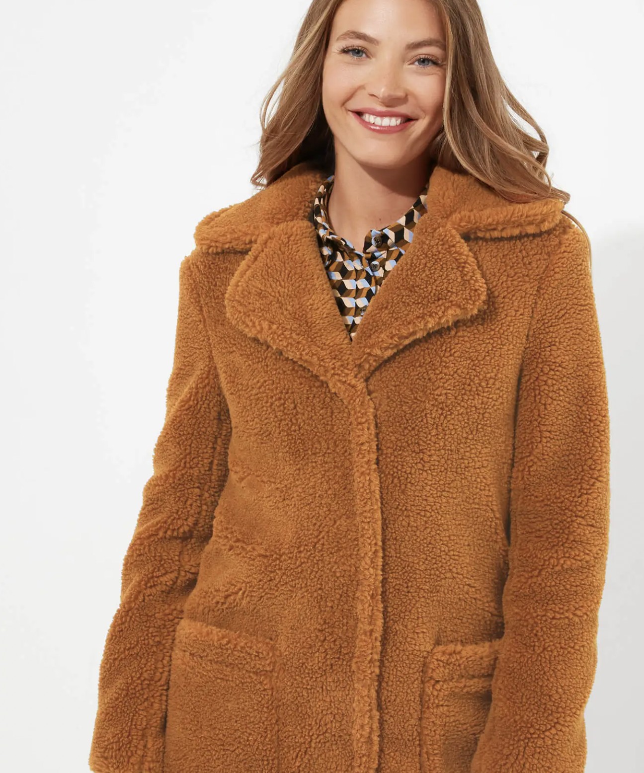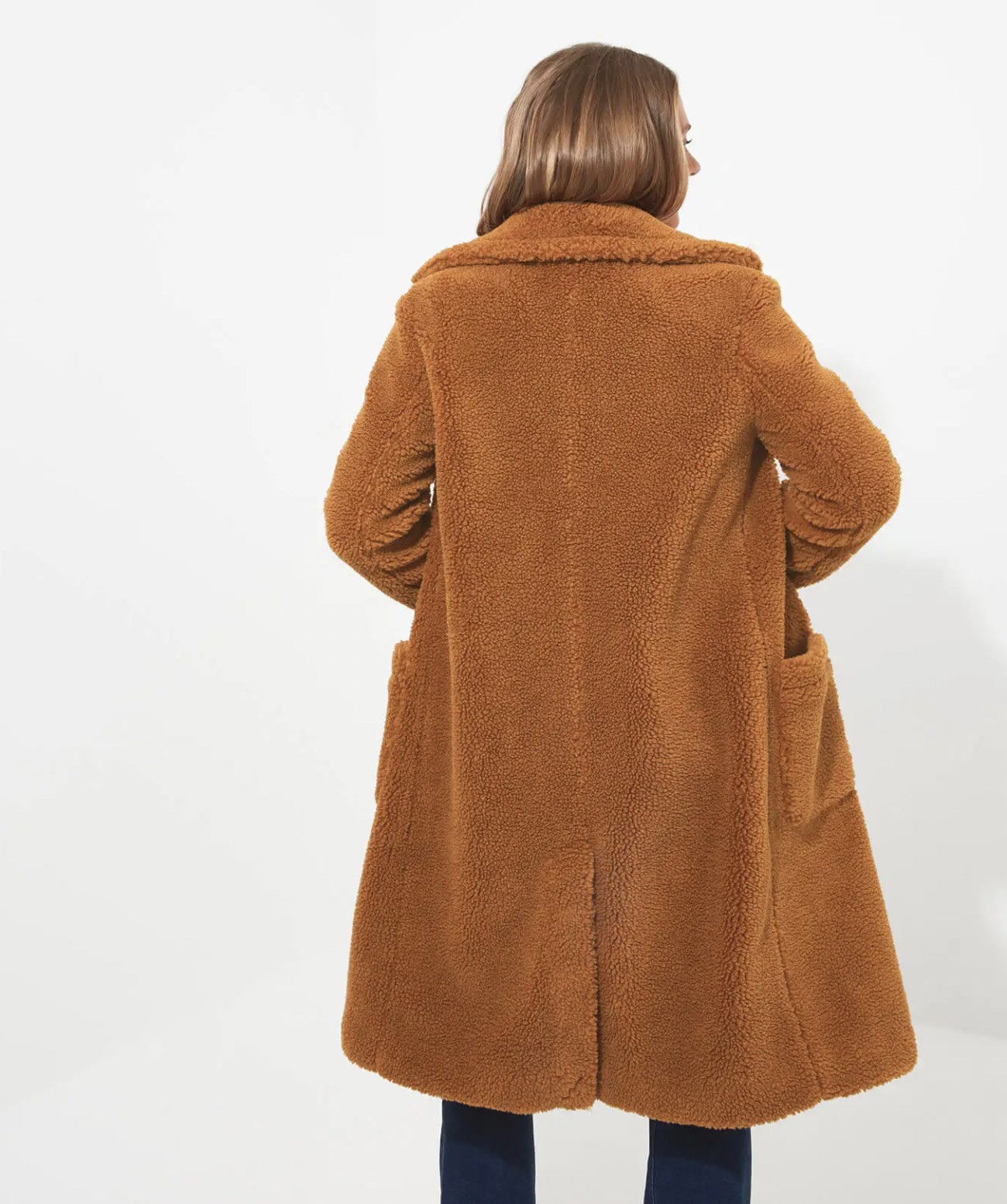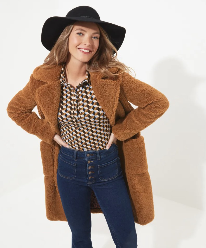 This oversized teddy coat is a real seasonal staple. Designed for style and warmth, we used a brand-new caramel colour then added a statement collar to help it stand out. Featuring two large pockets, this caramel teddy coat is as practical as it is stylish. Soft, cosy and really easy to wear, it’ll effortlessly keep out the winter chill.
