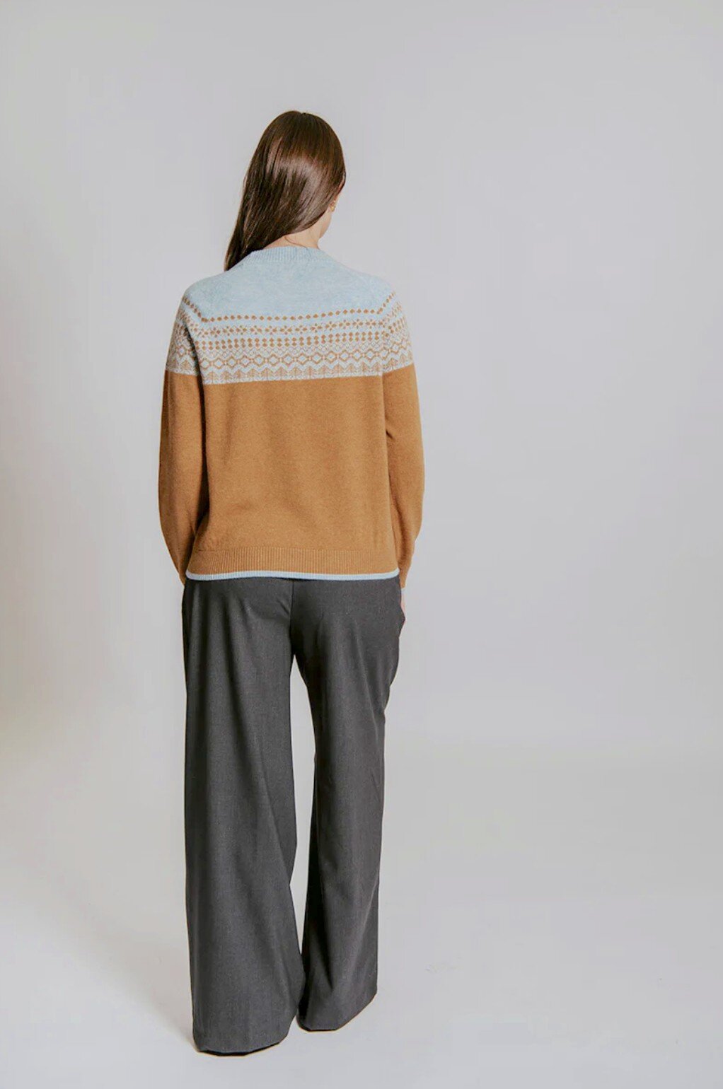 Two-Tone Fair Isle Pullover, featuring a classic Fair Isle pattern that blends subtle hues across the yoke with a contrasting solid base. This pullover offers cozy warmth and enduring charm, making it a perfect addition to your autumn and winter wardrobe. The combination of soft knit fabric and elegant detailing creates a look that’s easy to wear and effortlessly polished.